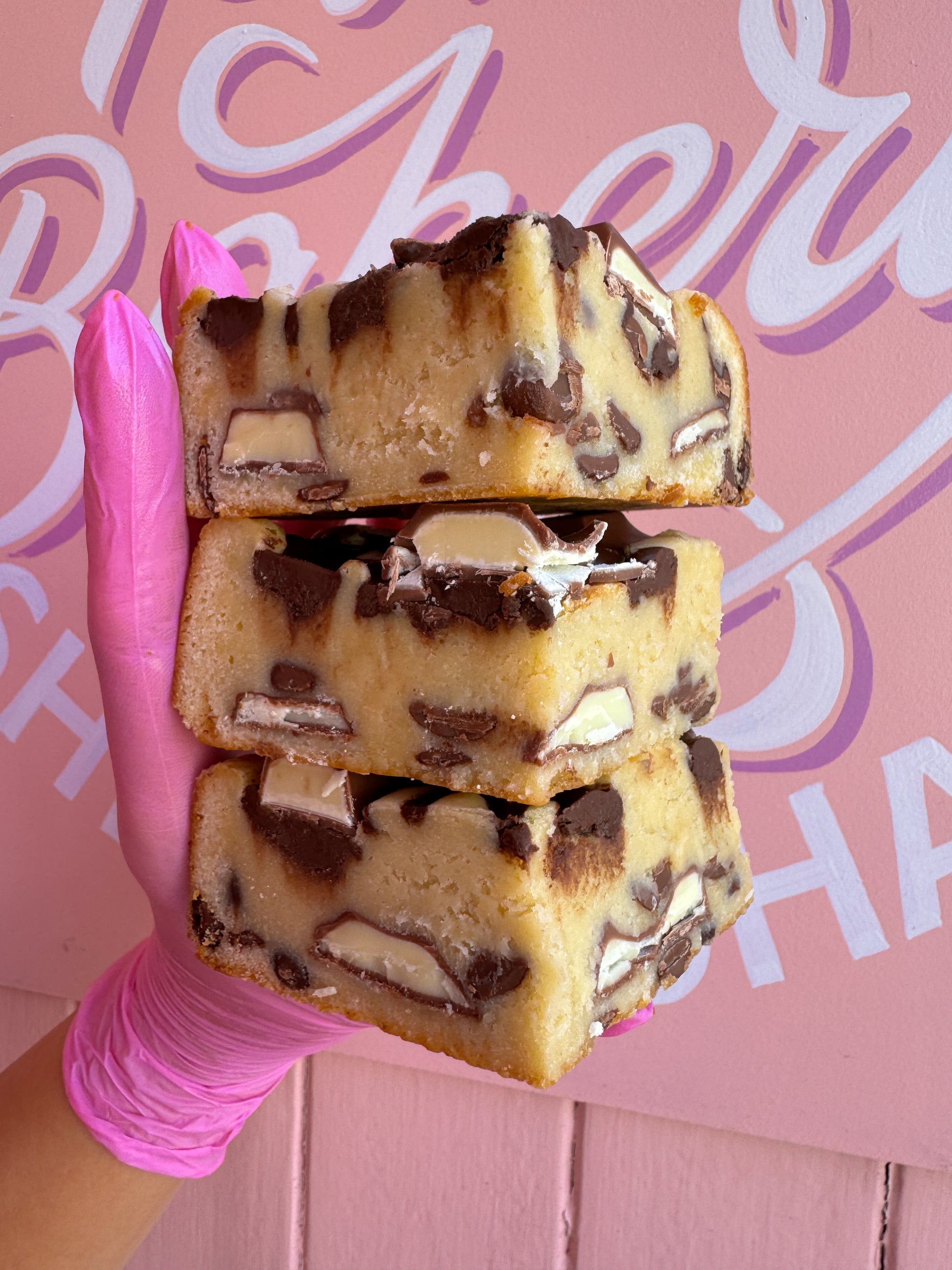 Our best selling fudgy blondie FULL of Kinder bars and luxury milk chocolate chips with a generous swirl of Nutella on top.